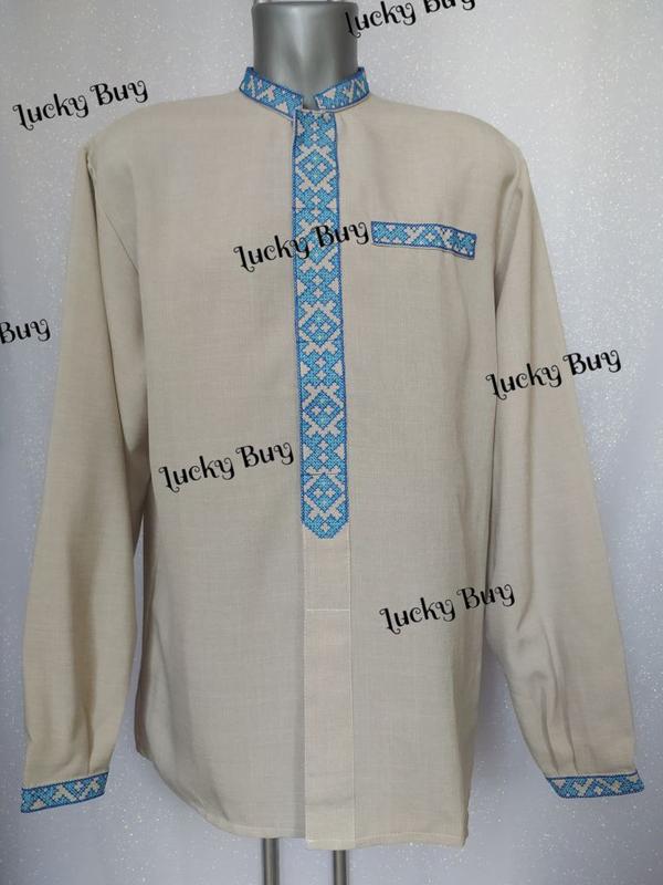 Код 296260(24) Мужская вышиванка с длинными рукавами. Орнамент синий/голубой. Мужская вышиванка. Вышитый орнамент двумя цветами. Основной цвет беж. Застегивается на кнопки. Рукава длинные, украшены вышитым орнаментом, застегиваются кнопками. Размер: 50,54 Замеры: 50: Плечи-48 см По груди-58 см По талии-56 см По стегон-59 см Рукав-65 см Длина-79 см 54 Плечи-53 По грудей-65 см По талии-63 см По стегон-66 см Рукав-69 см Длина-84 см ... грн