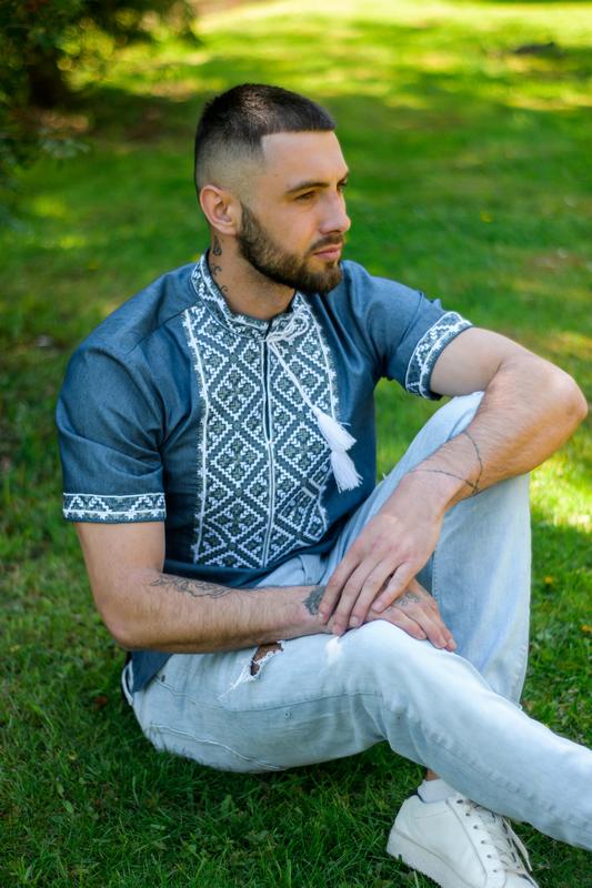Пересилка данной модели осуществляется новой по почте только после 100% оплаты на карточку приватбанка или монобанку в течение 1-5 рабочих дней. Более 2185 положительных отзывов за 5 лет верной работы говорят о том, что нам можно доверять!!!!!!!!!!! С накладной платой не работаем. Оригинальная мужская рубашка из натурального хлопка с длинным или коротким рукавом. Машинная вышивка глади бело-голубыми нитями на синей ткани. Длинный рукав с вышитыми манжетами за застежкой. Воротник стойка на завязке, с орнаментом.