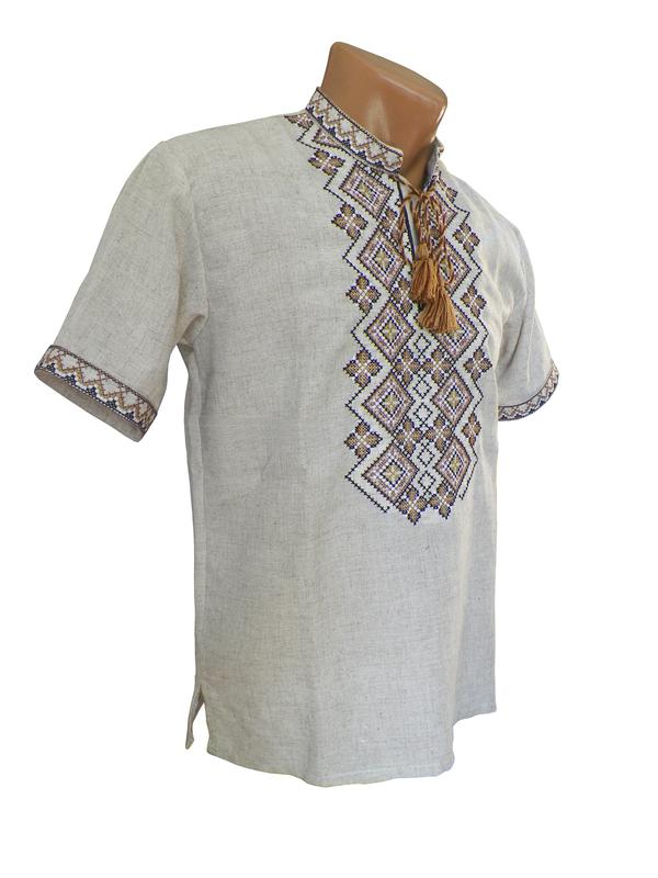 Льняная мужская вышиванка с воротником стойкой на короткий рукав