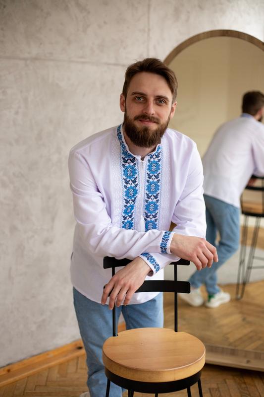 Вышиванка мужская на белом полотне с цветочным синим узором. Тканина - 48% бавовна, 52 % поліестер От 52 +100 грн