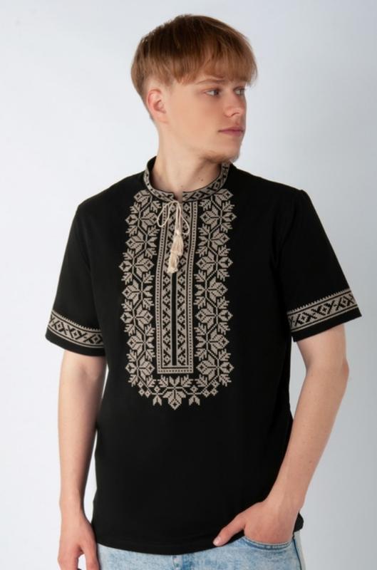 Мужская вышитая рубашка с коротким рукавом выполнена из полотна "Стрейч-кулир пинье". Данная модель прямого кроя имеет воротник-стойку. Воротник, рукава и перед рубашки украшены вышитым орнаментом. Полотно: стрейч-кулир пенье Склад: 95% бавовна, 5% еластан. Вышитый орнамент: машинная вышивка Советы по уходу: стирать при температуре не более 30°C. Разрешается стирка в режиме "ручная" или "деликатная", вышивку гладить только с изнанки. Изделие может дать усадку. Параметры модели: обхват груди 91, талия 80, бедра 101, рост 177 см. Размер одежды 48