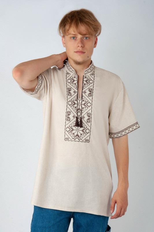 ‼️доставки через шкаф нет!!️ Мужская вышитая рубашка с коротким рукавом выполнена из полотна "Льон". Данная модель прямого кроя имеет воротник-стойку. Воротник, рукава и перед рубашки украшены вышитым орнаментом. Полотно: льон Состав: 55% лен, 45% вискоза. Вышитый орнамент: машинная вышивка 48 р 770 грн 50 р 790 грн 52 р 810 грн 54 р 330 грн 56 р 850 грн
