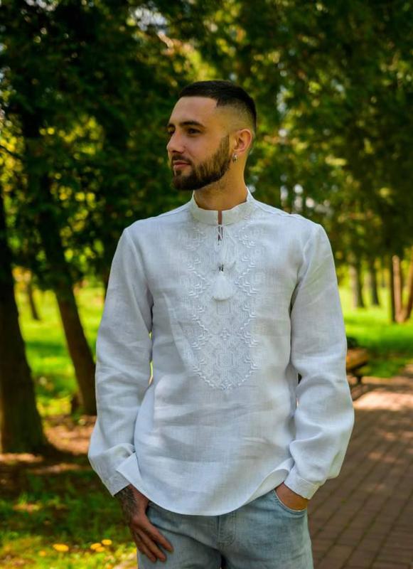 Мужская вышитая рубашка (белая по белому) выполнена на льне. тип вышивки – гладью. размер XS S M L XL 2X 3X 4XL мод.бар