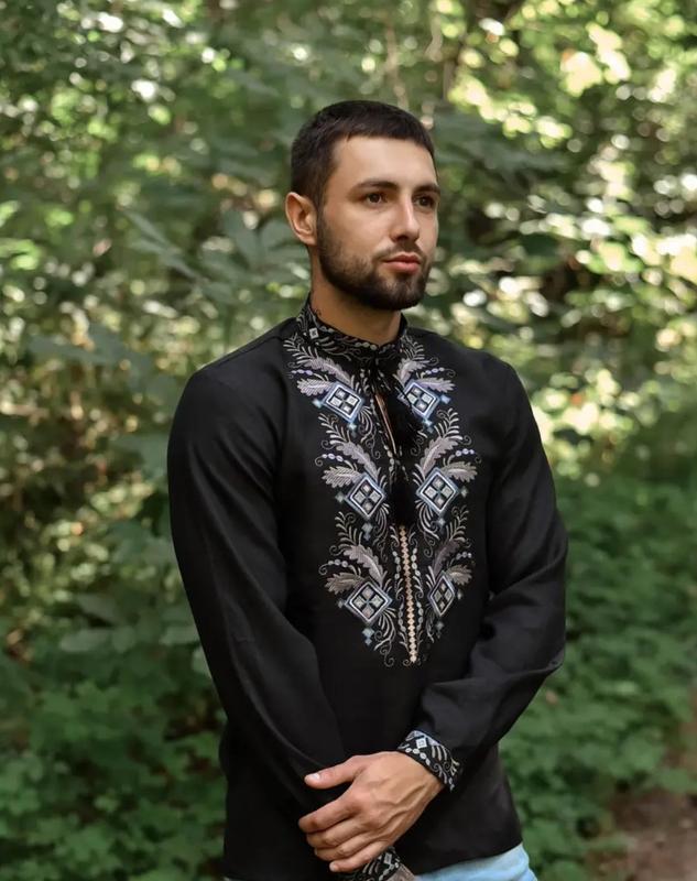 Черная вышитая мужская рубашка из льна, рризмер от 42 до 64 Рубашка мужская из гладкокрашенного льна, свободного кроя. Цвет основы - черный, вышивка - машинная. мод.луц