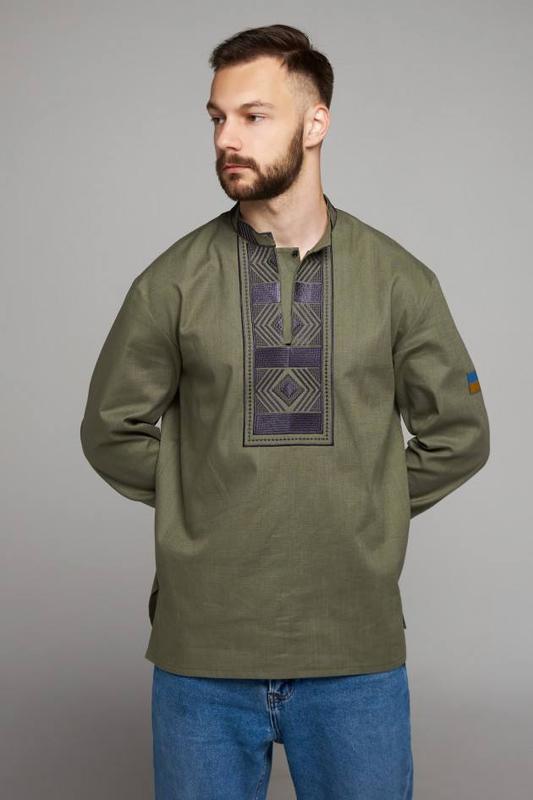 Мужская вышитая рубашка (хаки) выполнена на льне. Техника вышивки – гладь размер S M L XL 2XL 3XL 4XL мрд.бар