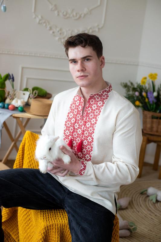 Вышитая мужская рубашка с красным узором. Ткань: полулен Цвет ткани - под натуральный лен. Узор размещен на груди и манжетах. Воротник стойкой, горловина с завязками.