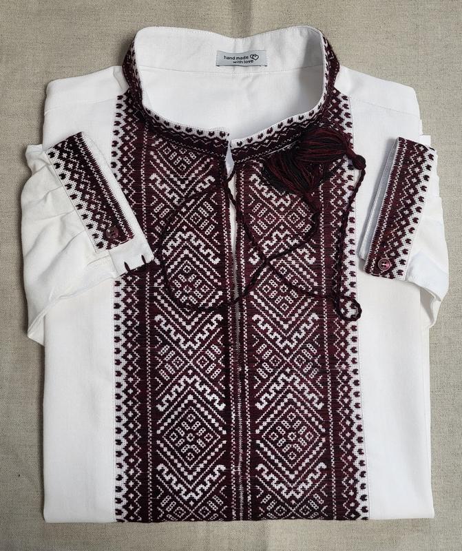 ### ### Чоловіча вишиванка ручної роботи "Статечна" великий розмір 4XL(60) (вишиті вставки) Монохромність за останні роки набула трендових мотивів у різних сферах діяльності. Однобарвний стиль не оминув і вишиванкову культуру. Розміри даної вишиванки (см): 1. ширина виробу - 69 2. довжина виробу -77 3. рукав - 67 - ### Вишиванка Handmade для чоловіків - розмір 4XL(60); - ### Тканина - домоткане полотно, 100% бавовна; - ### Вишиті вставки та акуратно вшиті в тканину; - ### Вишивка технікою "низь", акриловими нитками; - ### Горловина на замку чи кнопках (з наявних); - ### З довгим рукавом; - ### Нитки кольору бордо із переплетенням чорних; Розмірна сітка для визначення потрібного розміру вишиванки (розміри вказані за мірками ЛЮДИНИ*) *Якщо знімаєте мірки з готового виробу, тоді не дивуйтеся, що ширина сорочки є більшою (~<10 см), за вказану у таблиці. Все вірно, адже виріб повинен бути вільним, забезпечувати свободу та комфорт у пересуванні. РІСТ (см) Міжнародний розмір Український розмір Обхват шиї(см) Обхват грудей(см) Обхват талії(см) Довжина рукава (см) 168 XXS 44 37 88 78 61 171 XS 46 38 92 82 62 174 S 48 39 96 86 63 177 M 50 40 100 90 64 180 L 52 41 104 94 65 182 XL 54 42 108 98 66 184 XXL 56 43 112 104 67 184 XXXL 58-60 44-45 116-120 108-112 67 Не знайшли у даній таблиці потрібного розміру вишиванки? Це не привід залишати наш магазин. ************************** Телефонуйте чи звертайтеся через форму зв'язку на головній сторінці, пошиємо вишиванку під замовлення. В нашому інтернет-магазині ************************** ви маєте можливість придбати високоякісний етнічний одяг ручної роботи, а також замовити вишиванку ручної роботи під індивідуальне замовлення!