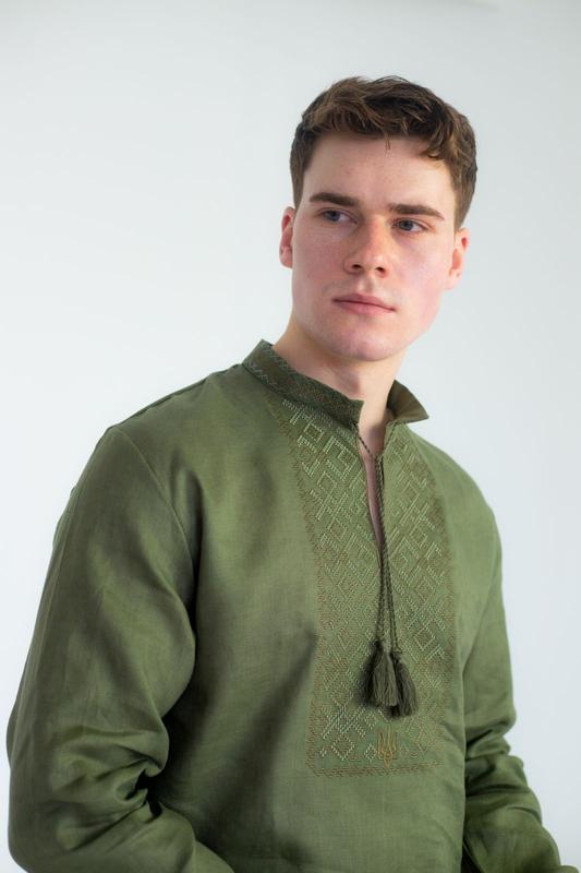 Мужская вышиванка с гербом хаки вышитая рубашка мужская стильная льняная рубашка хаки 301