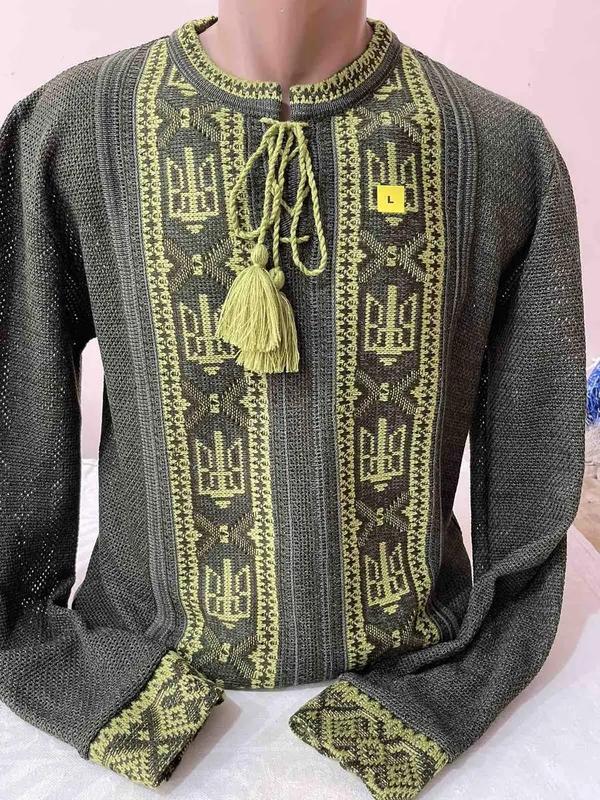 Мужской вязаный джемпер цвета хаки под заказ вышиванка трезубец символ