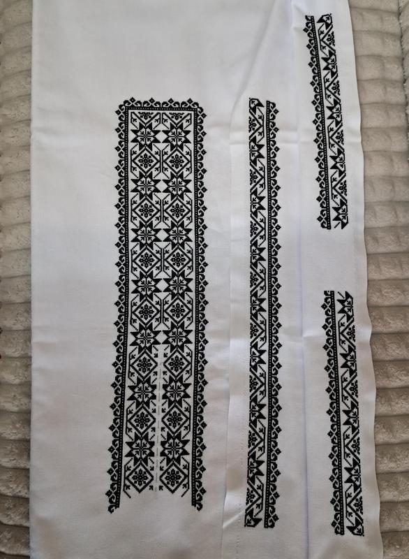 Заготовка чоловічої вишиванки Матеріал онікс білий Вишито нитками DMC чорна Вишито на одному відрізі матерії Розмір 1,5×1,5 м Можливо пошиття чоловічої вишиванки від 44 розміру до 60 розміру Комір довжина-50 см Манжети-26 см Перед вишиванки-50 см