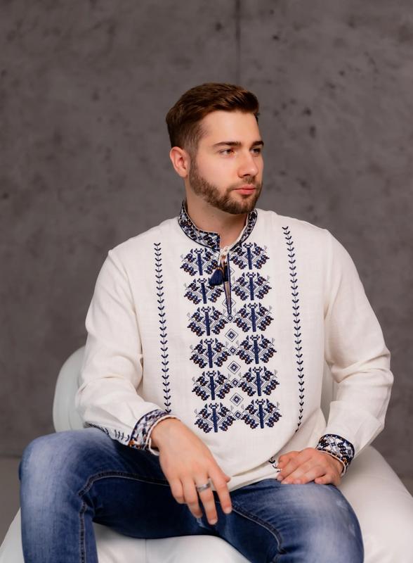 Мужская вышиванка (бежево-голубая) выполнена на натуральной ткани. Тип вышивки -гладь размер S M L XL 2XL мод.бар