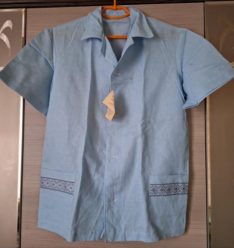 Мужская рубашка на пуговицах с вышивкой на карманах. Голубого цвета. Натуральный лен. Параметры: Длина 74 Плечи 47 ПОГ 54 ПОТ 54 ПОБ 52 Рукав длина 22 Рукав ширина 20