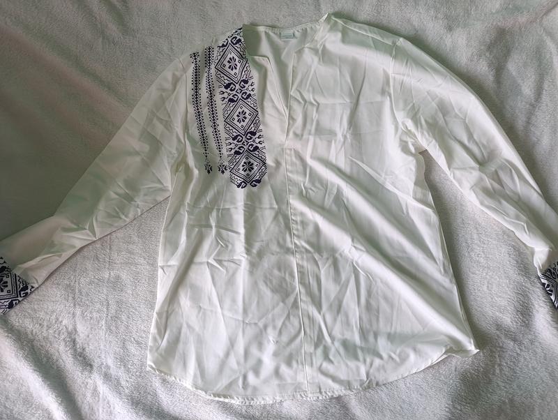 Белая мужская вышиванка. Размер хl, сверху маленький треугольный вырез, рукава на пуговицах. Принт напечатан.