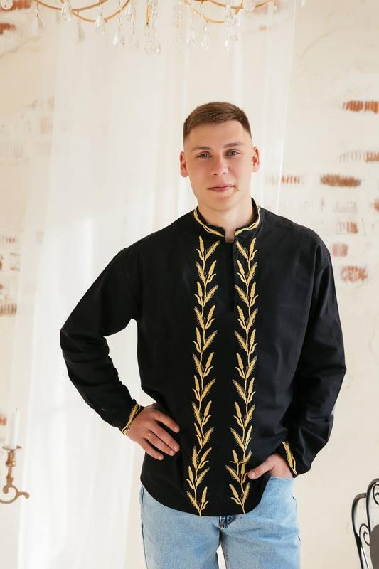 Мужская черная рубашка вышиванка с вышитыми колосками