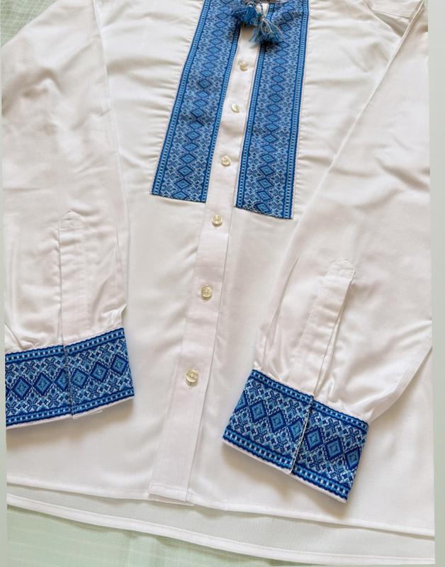 Вишиванка чоловіча. Розмір 50-52 (дивитись по замірах). Вишивка голуба. Горловина на завʼязках. Рукав довгий з манжетами на кнопках. Гарна святкова сорочка. Попереду ґудзики. Заміри: плечі 51 см, рукав 67 см, ширина в грудях 64 см, довжина 76 см.