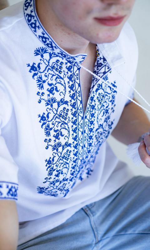 Рубашка вышиванка мужская рубашка вышитая с коротким рукавом белая с синей вышивкой 317