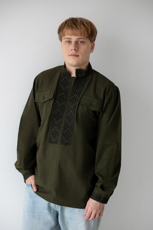 Мужская вышитая рубашка с длинным рукавом в стиле "Милитары", выполнена из льняного полотна. Льняная ткань отличается высокой прочностью, отлично впитывает влагу, обладает хорошими свойствами воздухо- и теплопроницаемости, проста в уходе и долговечна в использовании. Данная модель прямого кроя, имеет воротник-стойку, рукава с манжетами на застежке и накладные карманы спереди, воротник, манжеты и перед рубашки украшен вышитым орнаментом. Полотно: лляна тканина Состав: 55% лен, 45% вискоза. Вышитый орнамент: машинная вышивка Рекомендации по уходу: стирать при температуре не более 30°C. Допускается стирка в режиме "ручная" или "деликатное", вышивку гладить только по изнаночной стороне. Изделие может дать незначительная усадка. Параметры модели: обхват груди 99, талия 84, бедра 106, рост 177 см. Размер одежды 52