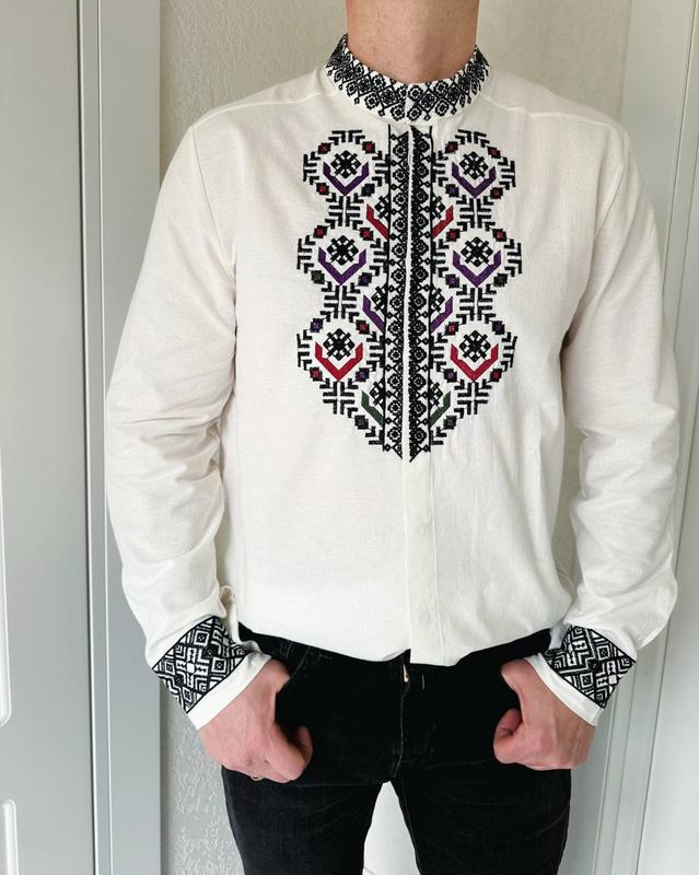Вышиванка мужская Модель 1015 амур) Производитель Турция Размеры S, M, L, XL Тканина котон 80%, 20% поліестер Тканина домотканий льон Цвет: молочный Вышиванка выполнена в традиционном украинском стиле, с геометрическим орнаментом. Она имеет классический крой с длинными рукавами, воротник-стоячку и застежку на пуговицы. Вышивка размещена по центру груди, на воротнике, манжетах и вдоль планки. Замеры S НОГ - 57 см Длина - 69 см Длина рукава от горловины - 80 см М НОГ- 59 см Длина- 72 см Длина рукава от горловины - 84 см L НОГ- 61 см Длина- 75 см Длина рукава от горловины- 84 см XL НОГ- 63 см Длина- 77 см Длина рукава от горловины- 84 см Погрешность измерения +~1см