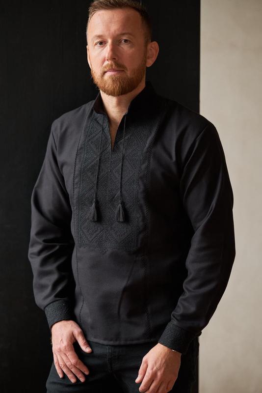 размер 46-56 размер 58-60 + 100 грн размер 62 + 200 грн Мужская вышиванка черного цвета с черной вышивкой “- это стильное воплощение традиций в современном исполнении. Выполнена из качественного домотканого полотна, она обеспечивает комфортную носку и приятную текстуру ткани. Прямой крой и длинные рукава добавляют классический вид и удобства в любых ситуациях. Рубашка имеет разрез с завязками, что добавляет ей этнический характер и делает ее универсальным вариантом как для праздничных событий, так и для повседневной носки. Манжеты застегиваются на кнопки, что добавляет практичности и завершенности образу.