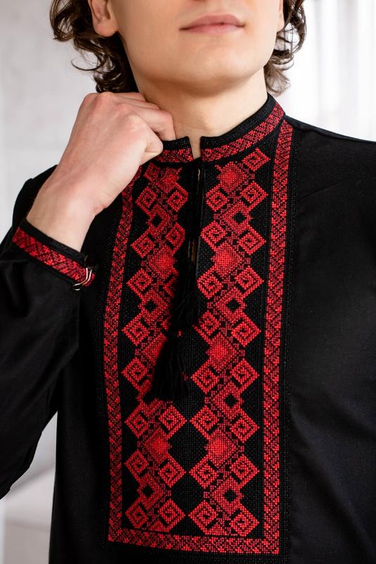 Вышиванка мужская черная с вышитым по ткани красными и бордовыми нитями украинским орнаментом. Также в пару есть женская вышиванка,1110 грн Вышивка машинная, компьютерная, что обеспечивает высокую точность рисунка и его устойчивость к деформации. Ткань очень приятная к телу, мягкая, с присущим вискозе шелковым блеском. Такая рубашка станет настоящей находкой для любого модника.