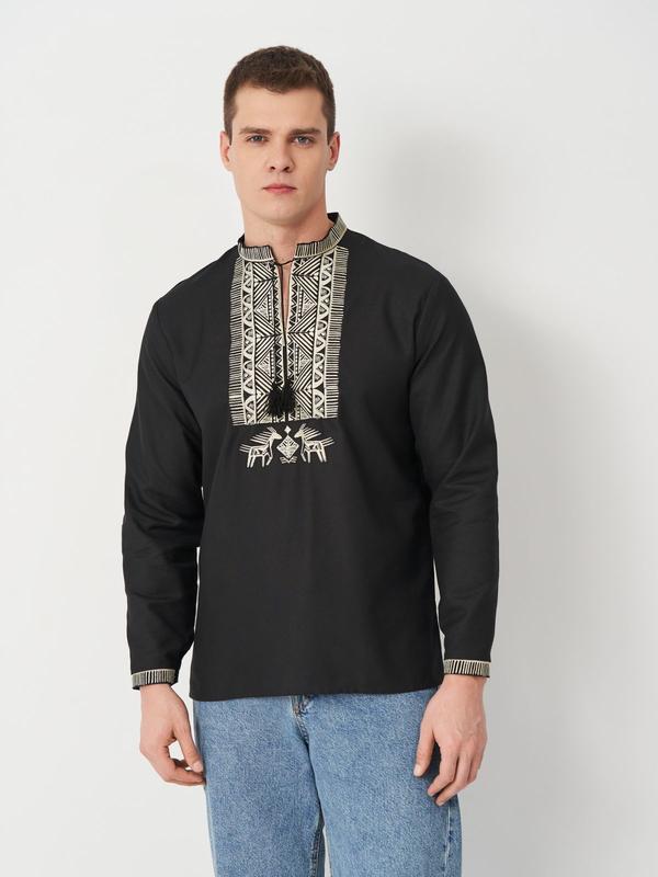 Рубашка вышитая мужская вышиванка черного цвета с геометрическим орнаментом парные вышиван...