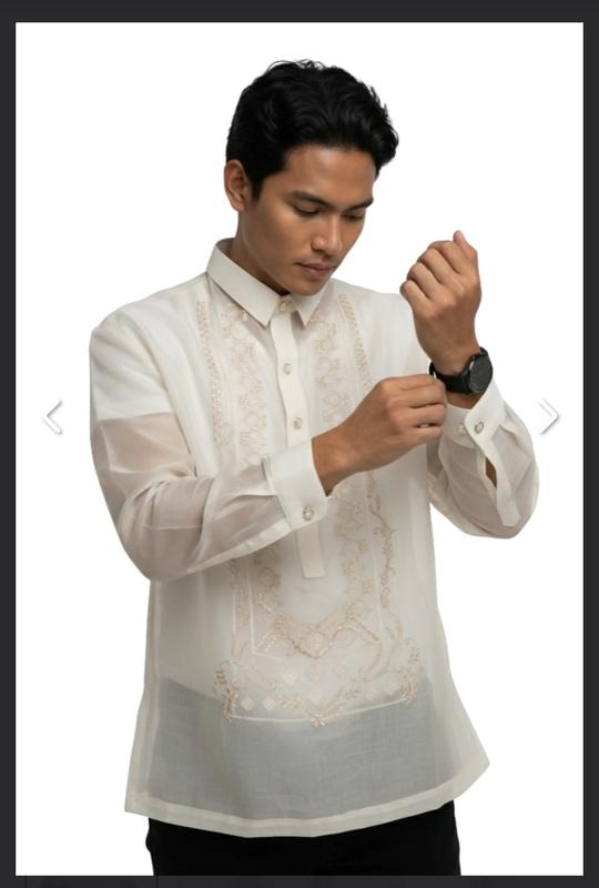 Шелковая мужская рубашка, украшенная изысканной вышивкой золотистыми нитями✨ Barong tagalog Filippino 💌 Barong Tagalog (или просто Barong) - это традиционная филиппинская мужская рубашка. Изготавливается из тонкой полупрозрачной ткани (традиционно - пена из волокон ананаса или дюсси из банановых волокон или шелка) и отделируется вышивкой на передней части. Материал: натуральный шелк (хотя бирка со составом отсутствует, этот бренд делает одежду исключительно из натуральных материалов) Рубашка достаточно дорога, можете промониторить в интернете. Сделаю более качественные фото.