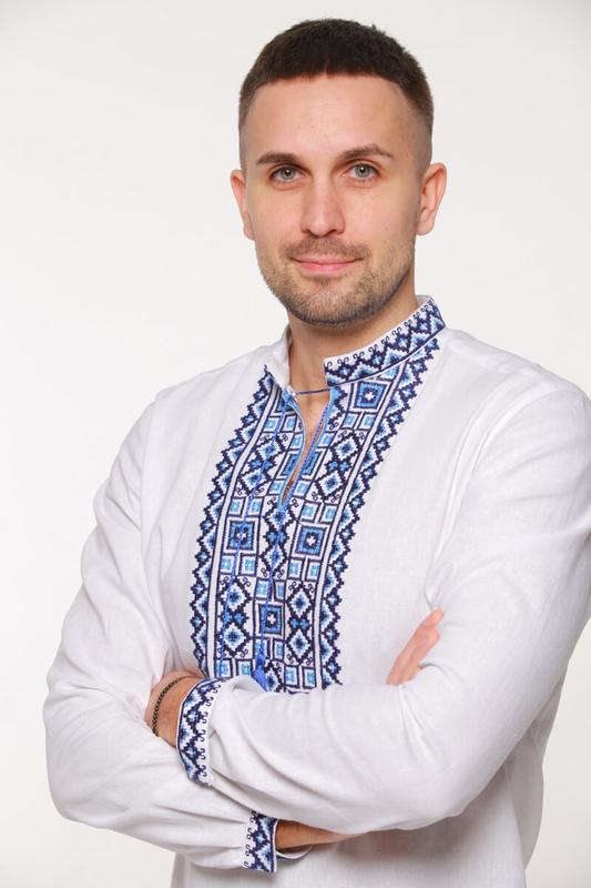 Рубашка «Подолье» стилизованная мужская вышиванка со старинными орнаментами. Рубашка сшита из белой льняной ткани и украшена голубовато-синей вышивкой. За счет крепкой шерстяной нити вышивка выглядит объемной и фактурной. Символика вышивки: Ромбы и квадраты относятся к древнейшим узорам наших предков. Ромбы символизируют плодородие и плодовитость, мужскую силу и духовное начало. Квадрат – символ земли, жизни и материального благополучия. Свое значение имеет цветовая гамма вышивки. Рубашка вышита синими и голубыми нитями, объединяющими в себе энергию неба и воды. Считается сильным оберегом для мужчин. Детали: прямой крой, воротник-стойка, завязки - кисти на горловине. Техника вышивки – гладь. Состав: ткань – лен, нити – шерсть. Особенности: деликатная стирка при температуре не более 30 С. Вышиванка идеально подходит и под классические брюки, и под джинсы. Благодаря натуральной ткани она приятна для тела и комфортна. Она станет настоящим оберегом, наполнит энергией и положительным настроением.