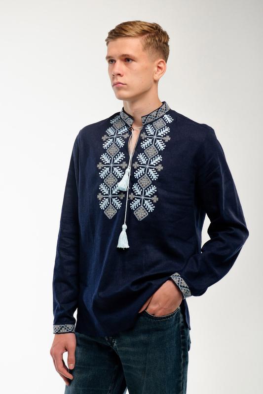 Наши предки оставили нам в наследство невероятную по своему богатству и красоте традицию – традицию вышивания. Хитроумные узоры, украшавшие наряды, в каждом регионе Украины свои.Вышивку вы видите на мужской рубашке «Наследие» – цветной орнамент расположен классически на груди. Вышиванка из натурального льна темно-синего цвета. Приятная к телу, она дарит желаемый комфорт, а благодаря прямому силуэту не сковывает движения. Изделие имеет длинные рукава и воротник стойку. Модель отлично сочетается с классической и современной одеждой – брюками или джинсами.
