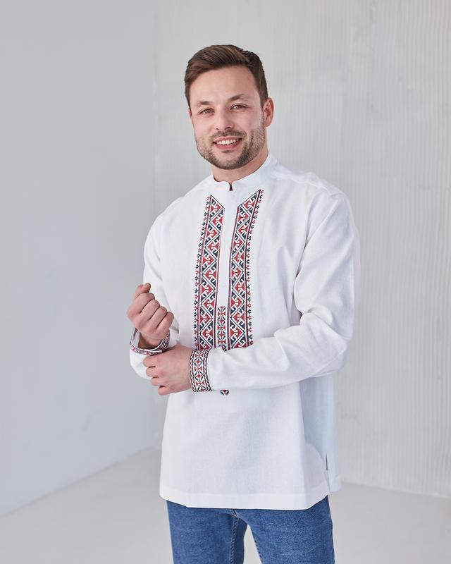 Мужская вышиванка с этническим узором, лен, универсальная вещь, в которой вы будете выглядеть стильно и неповторимо не только в повседневной жизни, но и на любом торжестве. Сшита из высококачественной натуральной ткани. Материал хорошо впитывает и отдает влагу, регулирует теплообмен и обладает бактерицидными свойствами. Комфортный простой крой. Для декора наши дизайнеры использовали сакральную символику украинской обереговой вышивки. Вышиванка – название традиционной украинской национальной одежды с вышивкой. Каждый элемент здесь не случаен: в вышитых орнаментах кроется древнее знание наших предков, что аккумулирует свет энергии, что делает рубашку еще более оригинальной и индивидуальной.