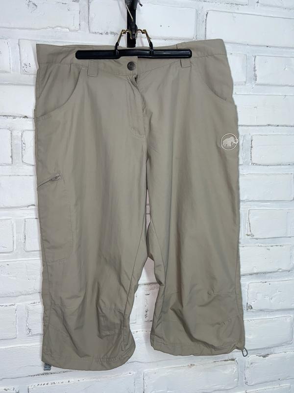 Капри Mammut, состояние идеальное, есть небольшая точка, ее не заметно, указано на 2 фото, размер указан 42, очень качественная фурнитура, впереди 2 осн. кармана и один на ноге на замке, лого вышитое у кармана, и сзади на правой ноге, снизу затягивается, сзади карманы на липучках. Замеры: длина 70, ПОТ 44, ПОБ 53, в самом широком месте штанина 36, на выходе 25