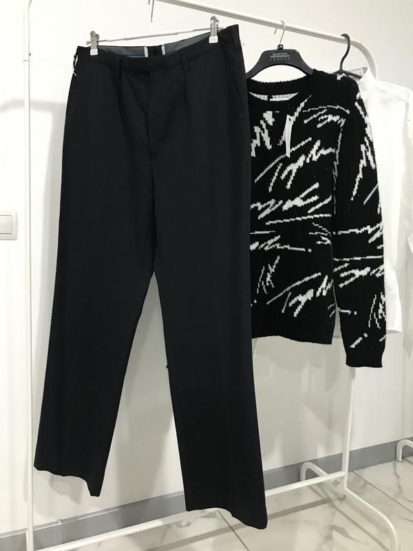 Размер:L Пояс :92 см Посадка:34/44 см Бёдра:114 см Ширина штанины сверху:35 см Длина:112/84 см Ширина штанины снизу 25 см Карманов:3 шт. Состав:55% полиестер 45% шерсть Качественные брюки Бирки нет