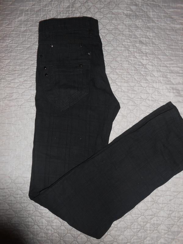Брюки в крупную клетку,материал плотный,приятный к телу.К сожалению фото не удалось передать весь внешний вид,и насыщенность черного цвета.Состояние отличное,кроме как чуть облезла краска с заклепок,но ее можно полностью содрать и вид никак не испортится.Замеры в поясе 40,по внутреннему шву 90,по наружному шву 120,бедра 50,посадка спереди 26,посадка ссади 34.