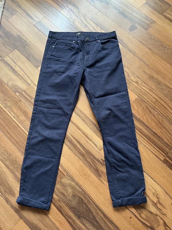 Брюки синего цвета зауженные к низу. Покрой Skinny Fit. Внизу штанины небольшой подворот, как мини-манжет ( ширина 3 см). Длина по боковому шву 94 см (с учетом пояса), в поясе 40 см, высота за шагом спереди 27 см, высота за шагом сзади 39 см, ширина штанины по нижнему шву 16 см. Куплены в Британии Размер ЕUR 31 Состав 98% хлопок ,2% эластан
