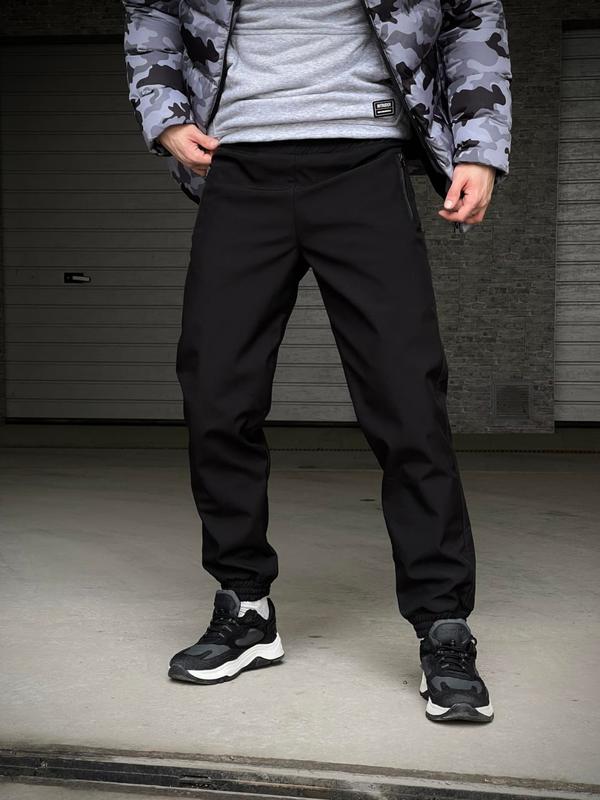 Мужские брюки SoftShell'Basic - Материал – Softshell - внутри приятный, мягкий микрофлис - в изделии 2 кармана на молнии - Вверху изделие регулируется резинкой. - Внизу штаны фиксируются с манжетой из резинки