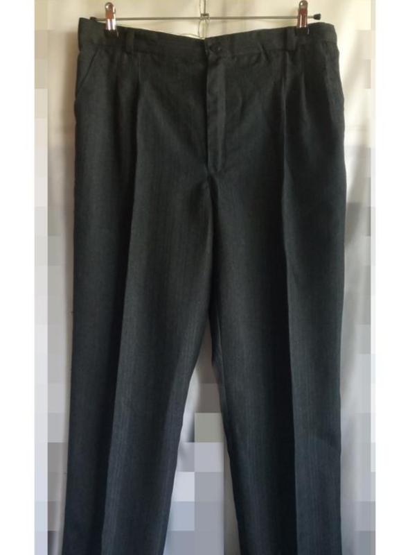 чоловічі штани штани класичний варіант більше підійдуть чоловікам у віці колір темно-сірий в смужку маленький розмір виміри пояс 86 стегна 108 пройма спереду 30,ззаду 40 довжина 114 ширина внизу 22 внизу оверлочены, не підшиті. порівнюйте зі своїми параметрами і вимірами своїх штанів.