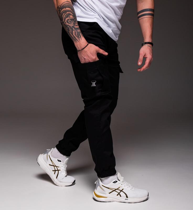 🔶 Артикул: 2002 👖 Черные джоггеры с накладными карманами на карабинах 📐 Размеры: S, M, L, XL 👍 Тканина: бавовна 100%. На манжетах, боковые карманы и накладные карманы на карабинах.