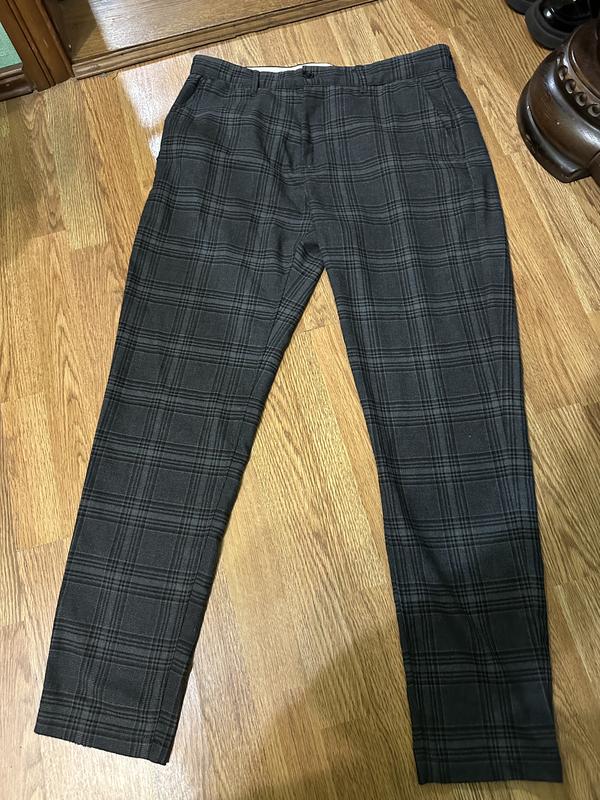 Брюки темно серого цвета ( почти черного) в клетку.62% полиэстер; 35% вискоза, 3% эластанукотона.на поясе с лямками.с боковыми карманами. Новая вещь, но без бирки. Замеры:Пот 44 см.Поб 57 см.Длина по боку 103 см.Длина шагового шва 75 см. Ширина по низу штанины 16 см. Высота посадки спереди 29 см.Высота сзади 33 см. Удобные и практичные классического стиля.