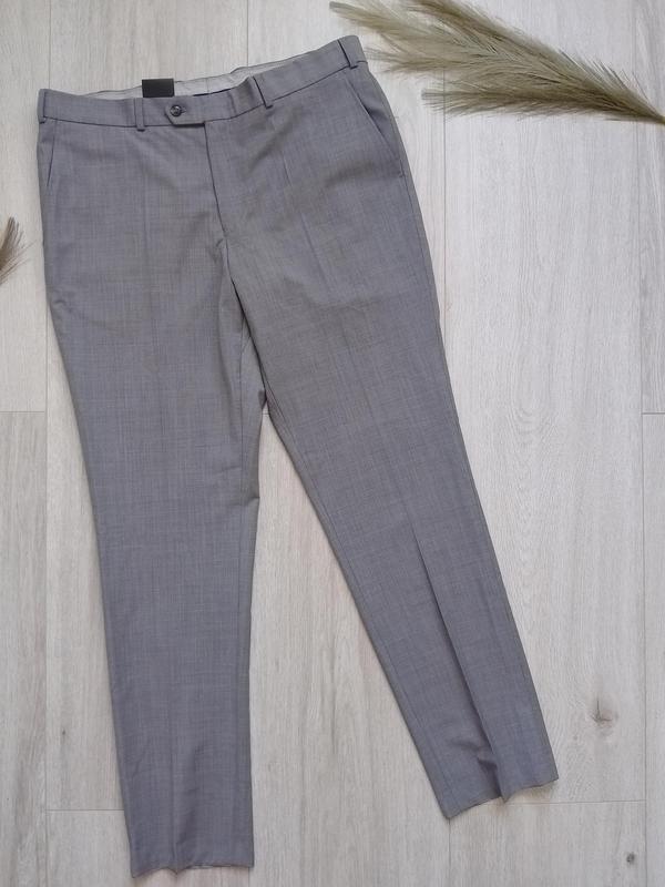 Мужские классические брюки, деловые штаны. Цвет серый. Размер 54. Модель Slim fit. Состав: 53% полиэстер, 43% шерсть, 4% эластан - Полуобхват пояс - 49 см, - Полуобхват бедер - 56 см, тянется 58 см - Полная длина - 109 см, Шаг - 83 см - Посадка спереди - 29 см - Посадка сзади - 44 см - Штанина - 20 см