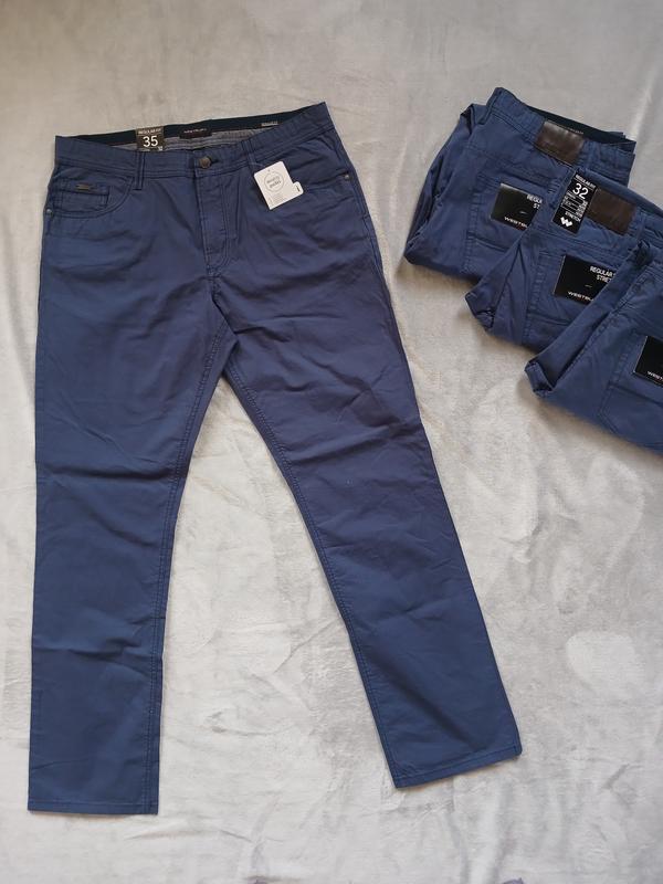 Мужские брюки/чиносы. Цвет - синий. Модель regular. Размер 30/32, 32/30, 32/32. Склад: 97% бавовна, 3% еластан Размер 30/32: - Полуобхват пояс - 40 см, тянется до 42 см, - Полуобхват бедер - 52 см, тянется 55 см - Полная длина - 107 см, Шаг - 82 см - Посадка спереди - 26 см - Посадка сзади - 37 см - Штанина - 19,5 см Размер 32/30: - Полуобхват пояс - 42 см, тянется до 44 см, - Полуобхват бедер - 53 см, тянется 56 см - Полная длина - 101 см, Шаг - 76 см - Посадка спереди - 27 см - Посадка сзади - 37 см - Штанина - 20 см Размер 32/32: - Полуобхват пояс - 42 см, тянется до 44 см, - Полуобхват бедер - 53 см, тянется 56 см - Полная длина - 107 см, Шаг - 82 см - Посадка спереди - 27 см - Посадка сзади - 38 см - Штанина - 20 см