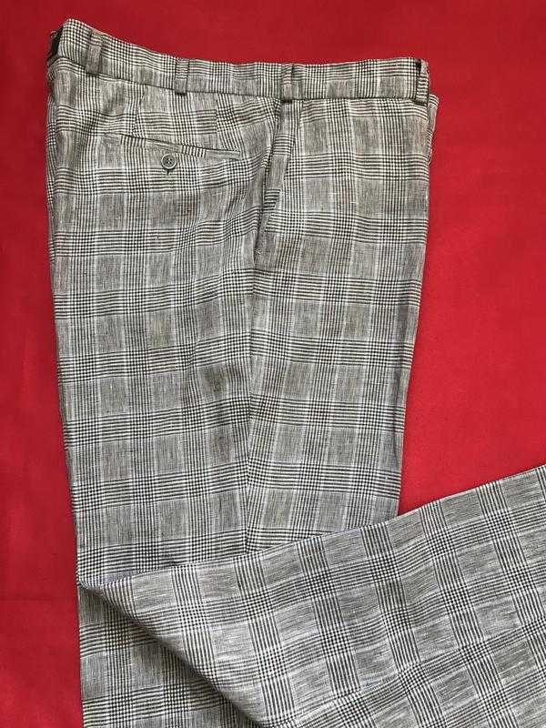 Легкие качественные салфетки. штаны в клетку итальянского бренда в отличном состоянии. Сезон - весна, лето. ПОТ - 50см, ПОС - 58см, длина - 107см, шаг - 81см, посадка - 38/35см соответственно, штанка - в пахе 35см, на выходе 23,5см.