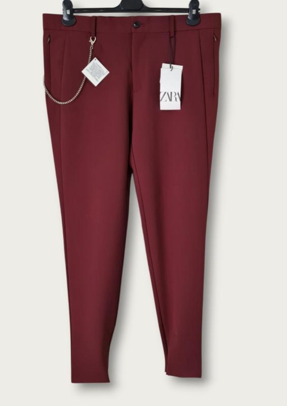 Брюки Zara bi-stretch оливковый цвет, с тонкой металлической цепочкой. usa 34/ eu 44 в поясе от посадки 48 посадка 25 полуобъем бедер 53 длина 100 шаг 75 штанины снизу имеют небольшие молнии. цвет бордо.