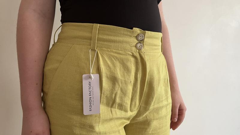 Штани 100% льон, розмір L , нові, стильні, гарно сідають по фігурі. Дівчина на фото має такі параметри: Талія - 79 см Бедра - 111 см Довжина ніг - 107 см Параметри штанів Талія - полу обхват 42,5 Бедра - по 65,5 Довжина від талії - 113,5 Ширина низу по - 28