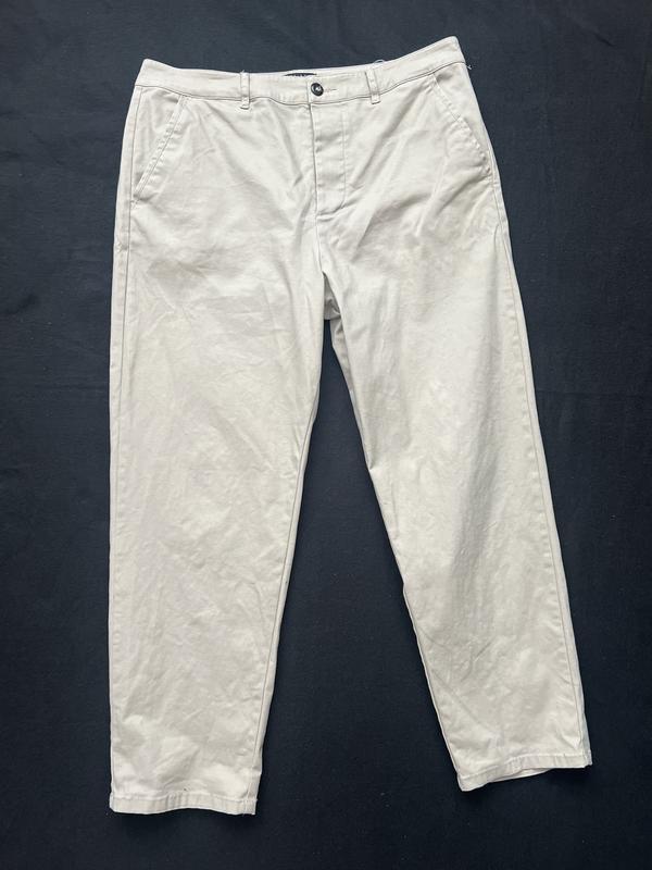 Легенькі брюки у бежевому кольорі, без паперової бірки (пластикова помпа лишилась), гарно сідають. З нюансів, відсутній один ґудзик, в принципі його і не видно, але враховано в ціні.