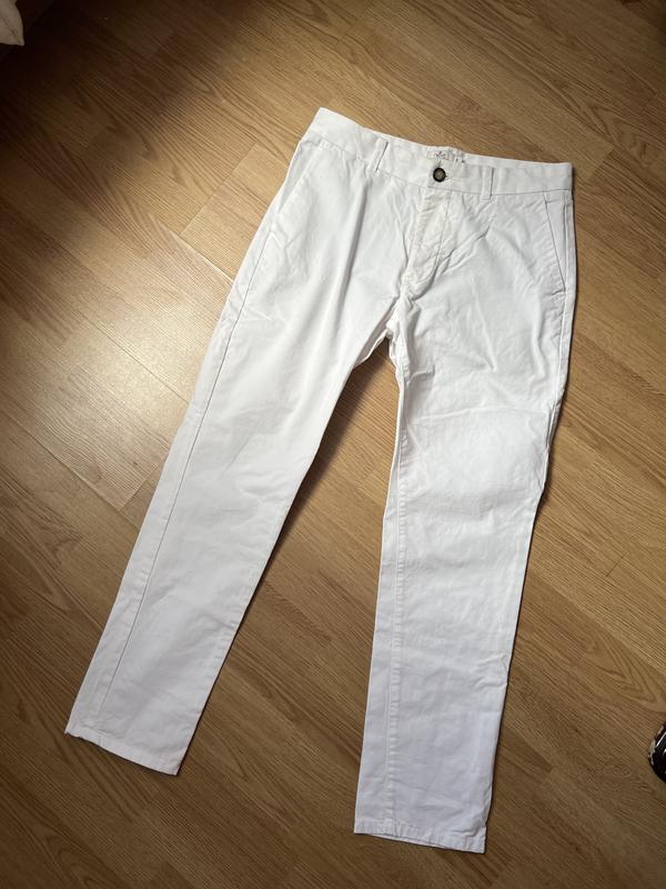 Розмір S Білі штани з натуральної тканини (100% бамбук) від фірми Next. З функціональними кишеньками, трохи завужені до низу. Стан нових! Замірі: • талія (півобхват) — 41 см • стегна (півобхват) — 51,5 см • шаговий — 70 см • довжина — 98 см