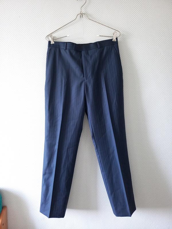 Мужские брюки английского бренда из 100% шерстяной ткани высокого качества в полоску. Новые. Размер по набору 32S. Замеры: талия - 42см, длина по внешнему шву - 101см, длина по внутреннему - 76см, ширина штанины внизу - 21см.