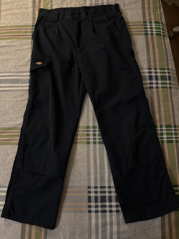 Темно-сині плісировані карго Dickies Зручні, живучі, функціональні - одна велика бокова кишеня на гудзику, дві маленьких бокових кишені, дві задні кишені на гудзиках, місце для карабіну присутнє. Ширінка YKK. Маленький нюанс - зацеп на останньому фото. Майже непомітний, особливо для штанів роботяги. пояс - 42 см довжина - 101 см вихід штани - 23,5 см