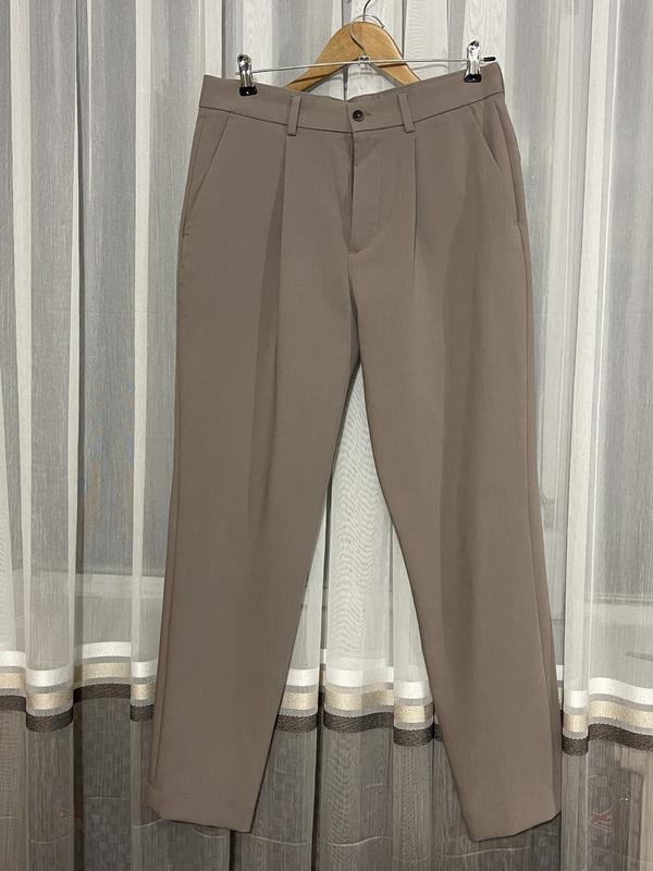 Продаю стильні та зручні штани актуального фасону. Ідеально підійдуть для створення як класичних, так і повсякденних образів. Колір: універсальний, елегантний, бежевий— що легко комбінується. Легка, приємна до тіла тканина (швидше за все, суміш поліестеру з віскозою), що не мнеться. Застібка на блискавку та ґудзик, бічні кишені, шльовки для ременя. Заміри: пот -39 см; поб - 49 см; довжина-101 см