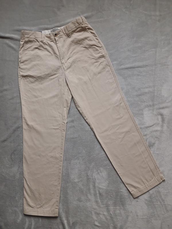 Мужские брюки чинос. Цвет бежевый. Модель regular (прямого кроя). Размер 32/31. Эластичный пояс на резинке. Состав: 65% полиэстер, 35% хлопок. - Полуобхват пояса - 42 см, тянется до 44 см - Полуобхват бедер - 53 см, тянется до 56 см - Посадка перед - 28 см - Посадка зад - 41 см - Крок - 78 см - Полная длина - 102 см - Напівобхват штанини внизу - 21 см.