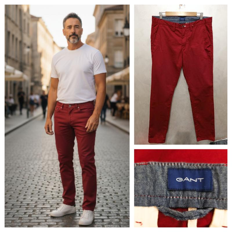 Мужские чиносы от премиального бренда Gant в благородном бордовом цвете. Материал: 100% хлопок Размер: W34L32 Состояние: новый, без следов ношения Детальные замеры: • Длина: 105 см • Шаговой шов : 80 см • Полуобхват талии: 45 см • Полуобхват бедер: 56 см • Посадка спереди: 26 см, сзади: 36 см • Ширина штанины вверху: 31 см, внизу: 17 см Классический крой чино с элегантной посадкой. Универсальная модель для офиса и повседневной носки. Качественное исполнение и фирменная фурнитура Gant.