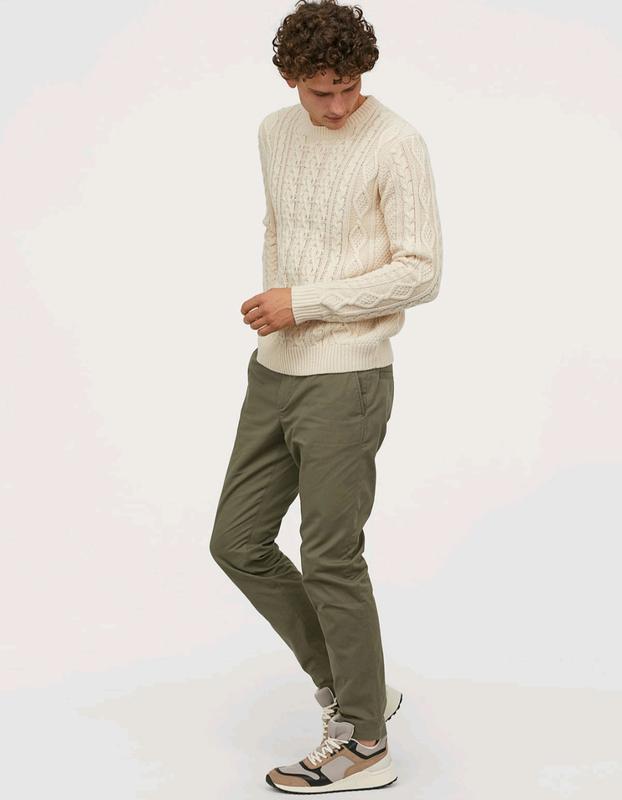 Брюки-чиносы из эластичного хлопкового твида. На чиносах боковые карманы и прорезные карманы сзади. Застёжка на пуговицы.